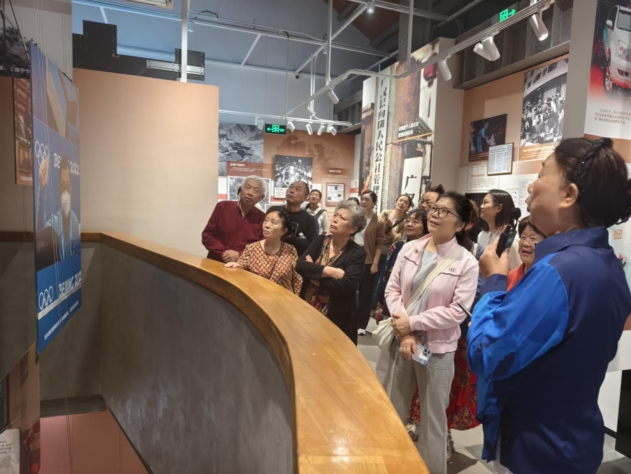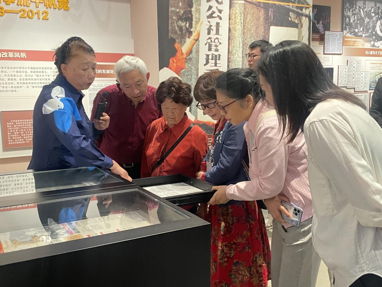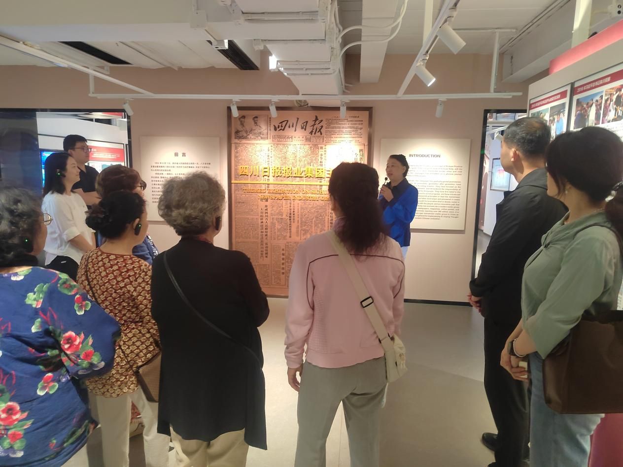 在讲解员的带领下,老同志和在职党员教师参观了“报业发展史”“融媒创新”“烟火巴蜀”等主题展厅。透过一个个珍贵文献、采编用具及历史影像,大家从传统的铅字印刷到数字化媒体时代的转变中,深刻体会四川报业从“铅与火”到“光与电”再到“数与网”的壮阔历程。展区中《四川日报》创刊初期的老照片、手写稿件等实物,勾起了许多老同志对往昔岁月的回忆,大家不时驻足凝视珍贵影像、历史文物与文献资料,沉浸式回顾中国报业一路发展历程,感受媒体融合时代的万千气象。