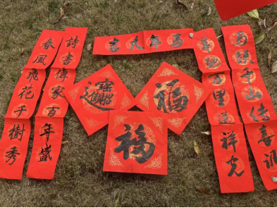 活动现场,红纸铺展如霞,笔墨酣畅淋漓。老同志笔走龙蛇、挥毫泼墨,一笔一划力透纸背,引来阵阵赞叹;青年学子胸有成竹,屏息凝神挥毫,现场师生纷纷点赞。师生们行楷隶篆各展风姿,一幅幅寓意吉祥的春联跃然纸上。提前写好的春联和“福”字挂在树间细绳上随风飘扬,老教师含笑点头,学子们驻足观赏,有人轻声诵读着春联上的美好祝愿,有人举起手机定格这温暖瞬间。“桃李不言自成蹊,春风送暖育新人”“春催桃李遍天下,雨润栋梁立神州”“马跃千山传喜讯,羊驰万里送祥光”等定制联语,既饱含对离退休教职工昔日奉献的敬意,又寄托对马年福寿安康的期许;方正饱满的“福”字搭配灵动的骏马写意造型,将传统韵味与生肖特色完美融合,引得现场阵阵称赞 。